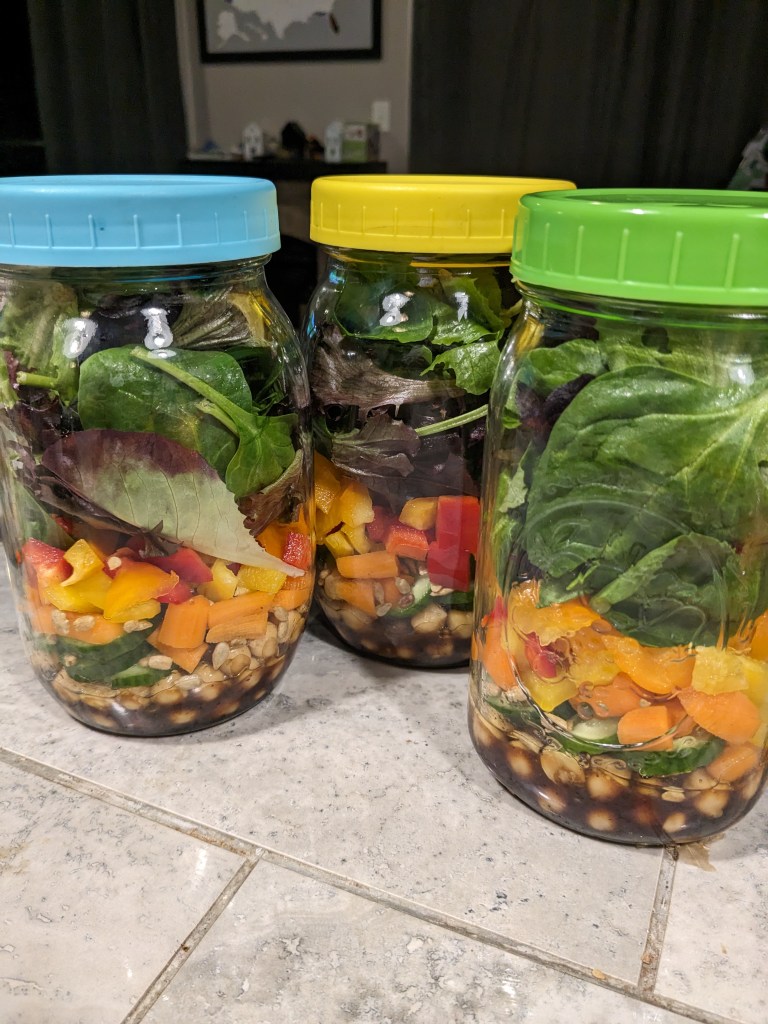 Growing up my dad used to make these giant one bowl salads which I called the garbage salad. As fantastic as it was, it was a huge variety of whatever we had in the fridge and whatever cans were in the cupboard. He threw in chickpeas, canned green beans, hearts of palm, beets any fresh veggies we had in the fridge and some kindtimes he’d add tuna or whatever was from dinner the night before. And balsamic vinaigrette was always his specialty. These were the best salads ever! So then I started thinking, why not make a mason jar salad with whatever I like and whatever I have. So meet the “Garbage Jar!” I do promise it tastes better than it sounds and I’ll tell you what I add in mine as a little motivation and potentially guidance in how this amazingness works!