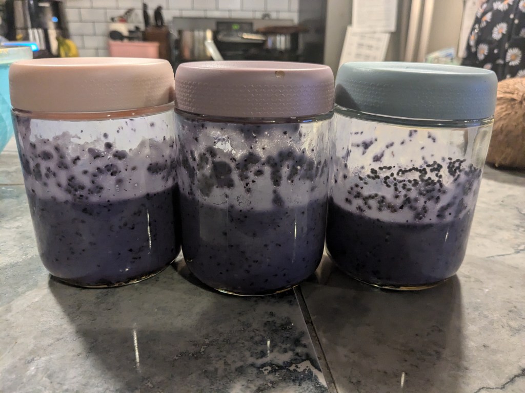Granola, coconut flakes, fruit Blend the milk and blueberries in a blender and add chia seeds and sweetener. Then mix and refrigerate overnight. My kids loved to add a bit of granola, coconut flakes and fresh fruit to the top!